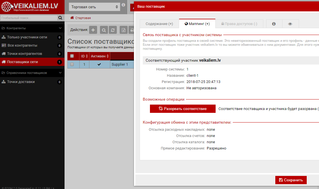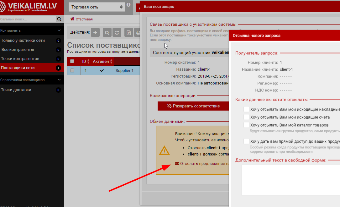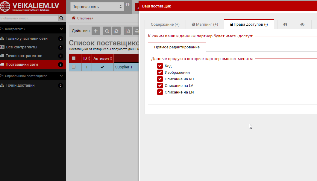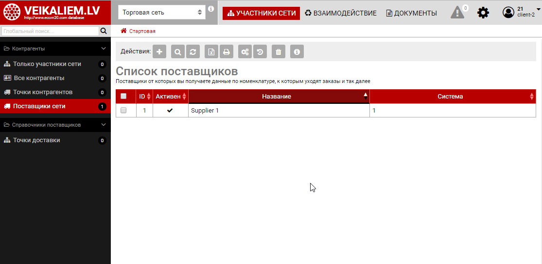 Торговая сетьОперации которые проводит торговая сеть в своей veikaliem.lv системе: Подключение поставщика к процессуЧтобы дать возможность поставщику видеть и редактировать свои данные в системе торговой сети должны быть выполнены следующие условия: