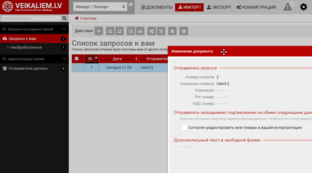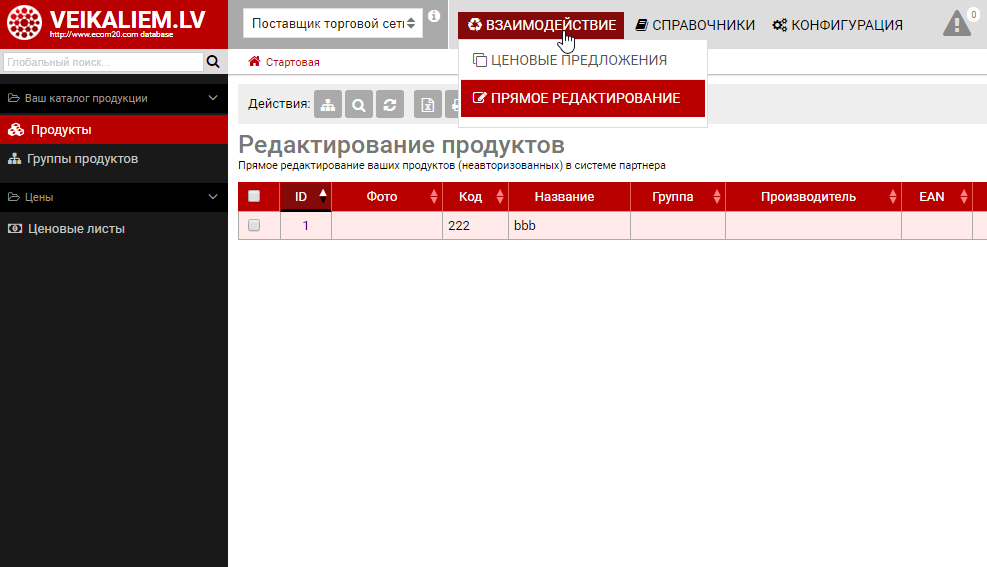 Контроль за процессомЕсли торговая сеть хочет видеть какие изменения поставщик вносил в продукты то эта информация доступна в карточке самого продукта либо в отдельном отчете по операциям прямого редактирования. ПоставщикОперации которые проводит поставщик в своей veikaliem.lv системе: Подключение к процессуПоставщик должен зарегистрироваться в на veikaliem.lv и получить доступы к своей системе. Эту операцию может сделать как он сам так и за него это сделать может торговая сеть. Далее нужно отослать торговой сети предложение на обмен данными либо нужно согласиться на уже полученное предложение от вашего партнера. На этом все. Доступы к редактированию должна сконфигурировать сама торговая сеть. Работа над даннымиЧтобы увидеть свои данные (неавторизованные, такими как их завела торговая сеть) поставщику нужно переключиться в режим "Участник торговой сети" => "Взаимодейтвие" => "Прямое редактирование". Далее в этом разделе поставщик может открывать любые обьекты и редактировать их в тех рамках которые задала торговая сеть. Все изменения журналируются и режиме реального времени видны в системе сети. На B2B и B2C платформы данные экспортируются с частотой заданной в конфигурации обмена данными. |
