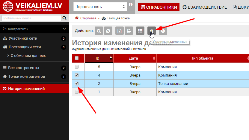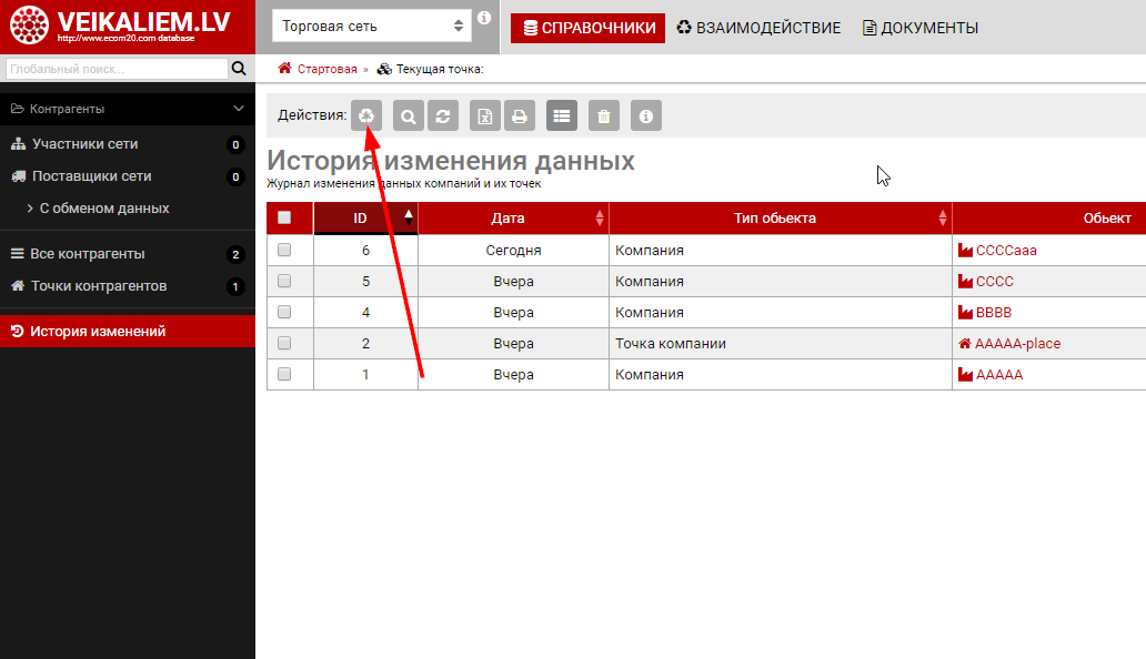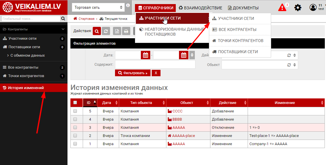 ИнтерфейсСистема торговой сетиИсторию изменений участников которую автоматически собирает система торговая сеть может увидеть в разделе "История изменений" (1).