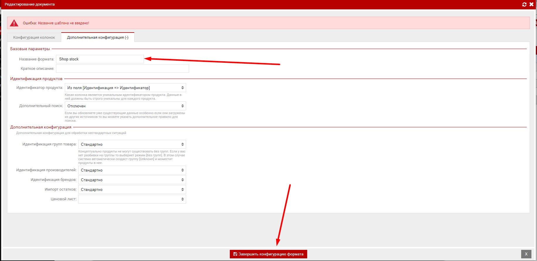7) вводим название, потом устанавливаем идентификатор товара и при необходимости отмечаем исключения для отсутвующих данных , после чего завершаем конфигурацию формата
