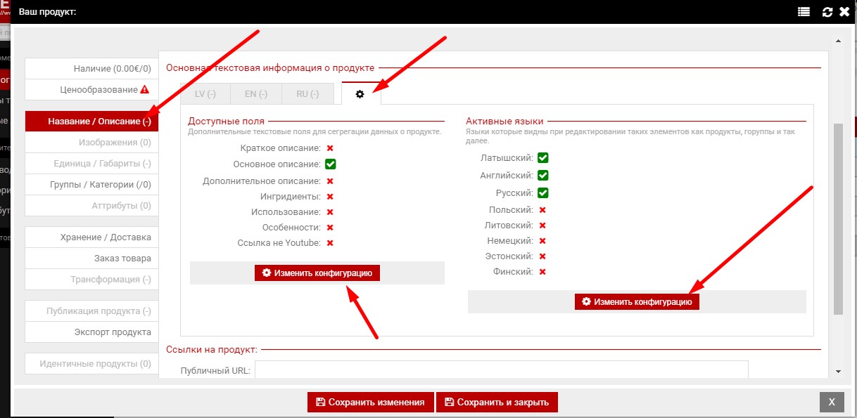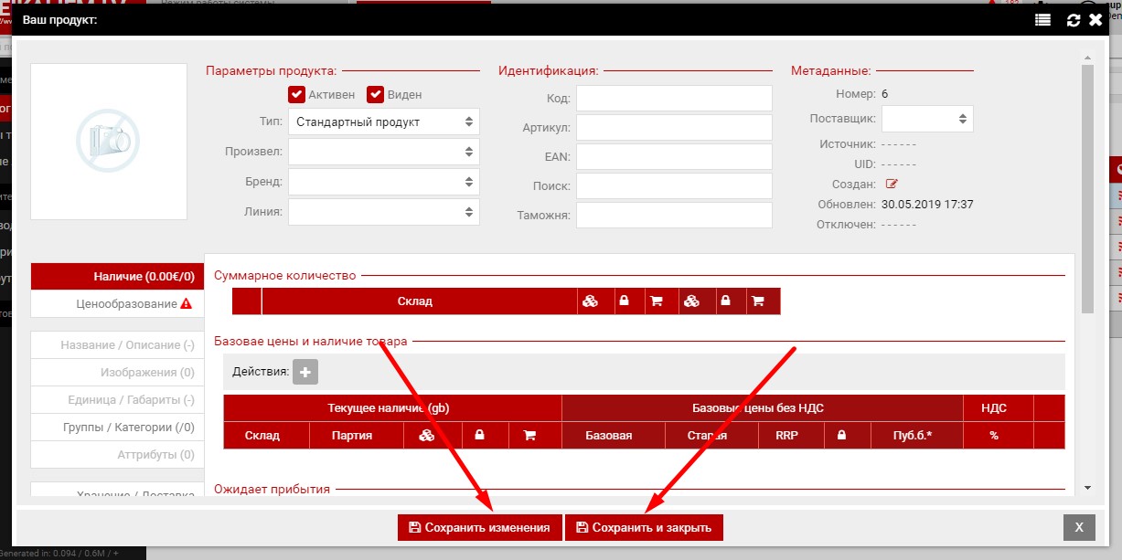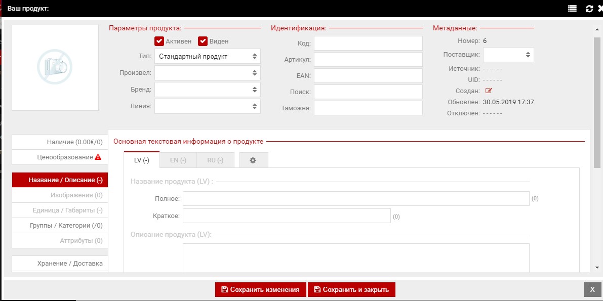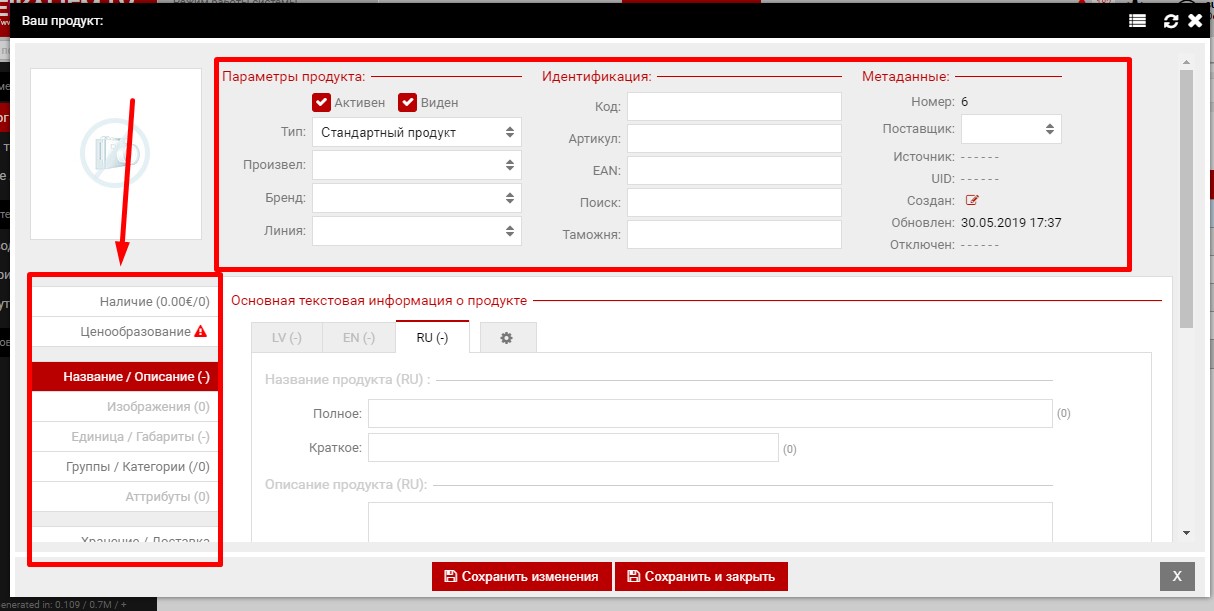 В верхней части окна расположены 3 блока: Параметры продукта, Идентификация и Метаданные, три данных блока всегда видны в карточке продукта, под ними отображаются все остальные параметры продукта.