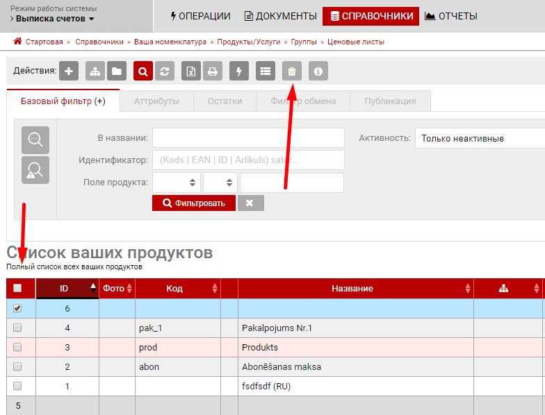Товар может быть полностью удалён, что приведёт к утере всех его данных, либо деактивирован, в таком случае он будет скрыт из списков , но оторажён в связанных документах (счетах, накладных, заказах и т.д.), при помощи фильтра, в любом из списков, можно отобразить деактивированые продукты.