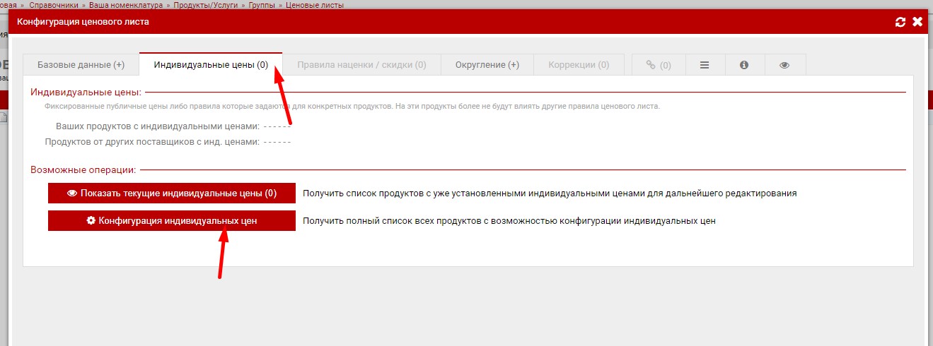 Если вы хотите прописать цену для каждого из продуктов, то переходите в закладку "Индивидуальные цены" и там нажимаем на кнопку "Конфигурация индивидуальных цен"