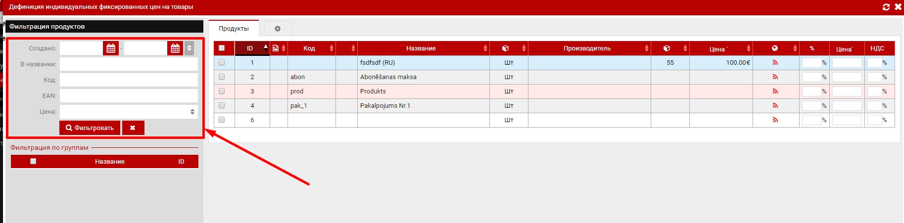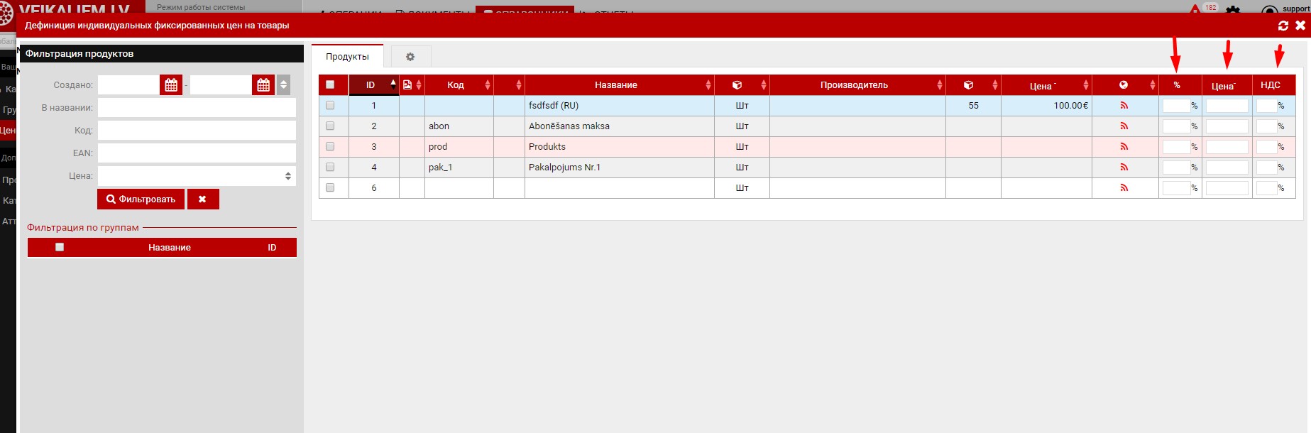 В правой части экрана располагаются продукты и для каждого из продуктов возможно ввести 3 параметра : "%", "Цена-"/"Цена+" и "НДС" .