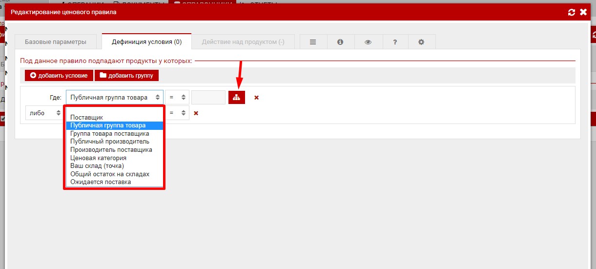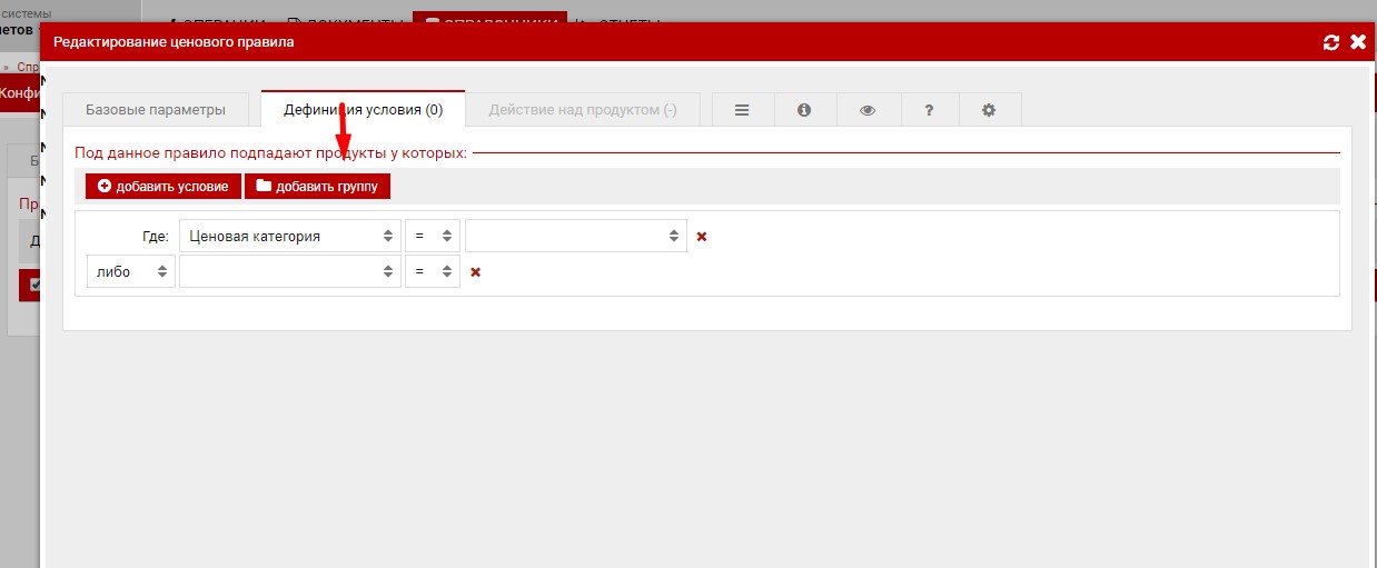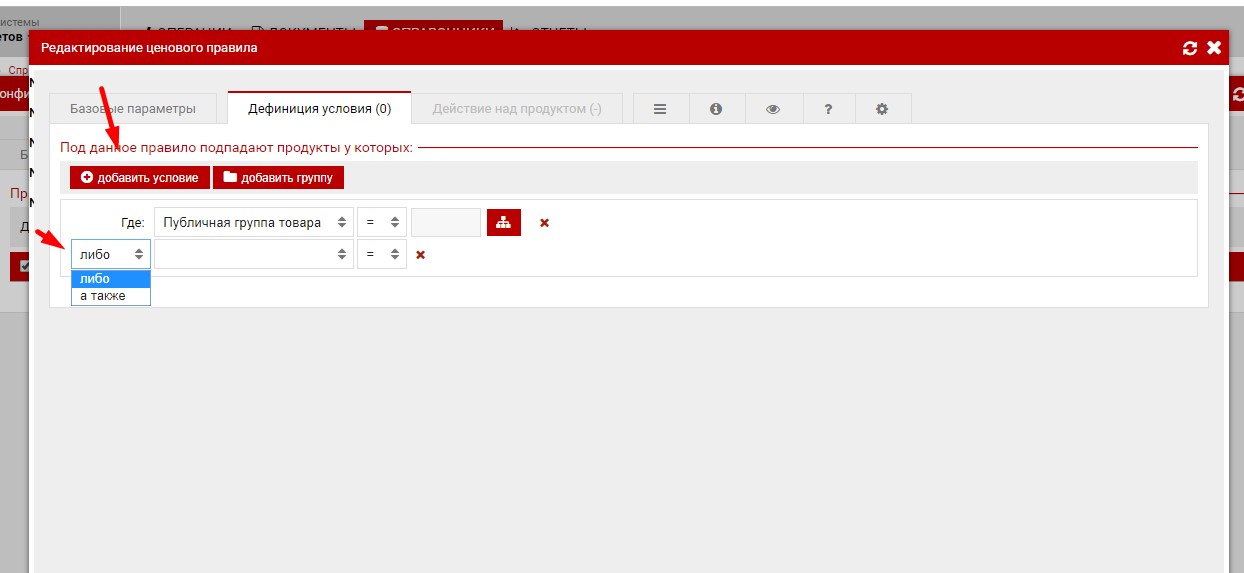 Так-же рядом с кнопкой "Добавить условие" если опция "Добавить группу" , данная функция сравнима с скобками, часть условий наценки будут заключены в скобки и будут образовывать отдельное сложное условие.