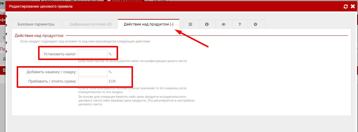 в закладке "Действия над продуктом" можно установить савку НДС, процентуальную наценку/скидку или наценку/скидку в виде определённой суммы.