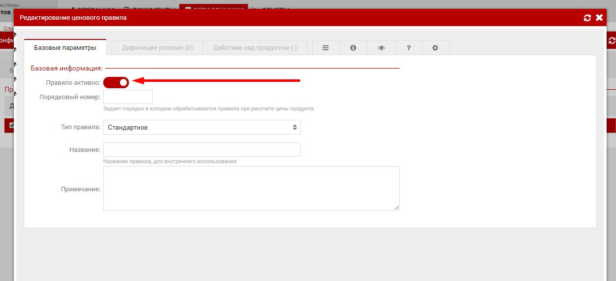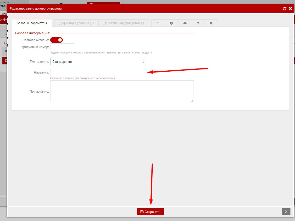 Когда настроены условия наценки и сама наценка, то остаётся перейти в закладку "Базовые параметры" и заполнить название. после чего сохранить изменения.