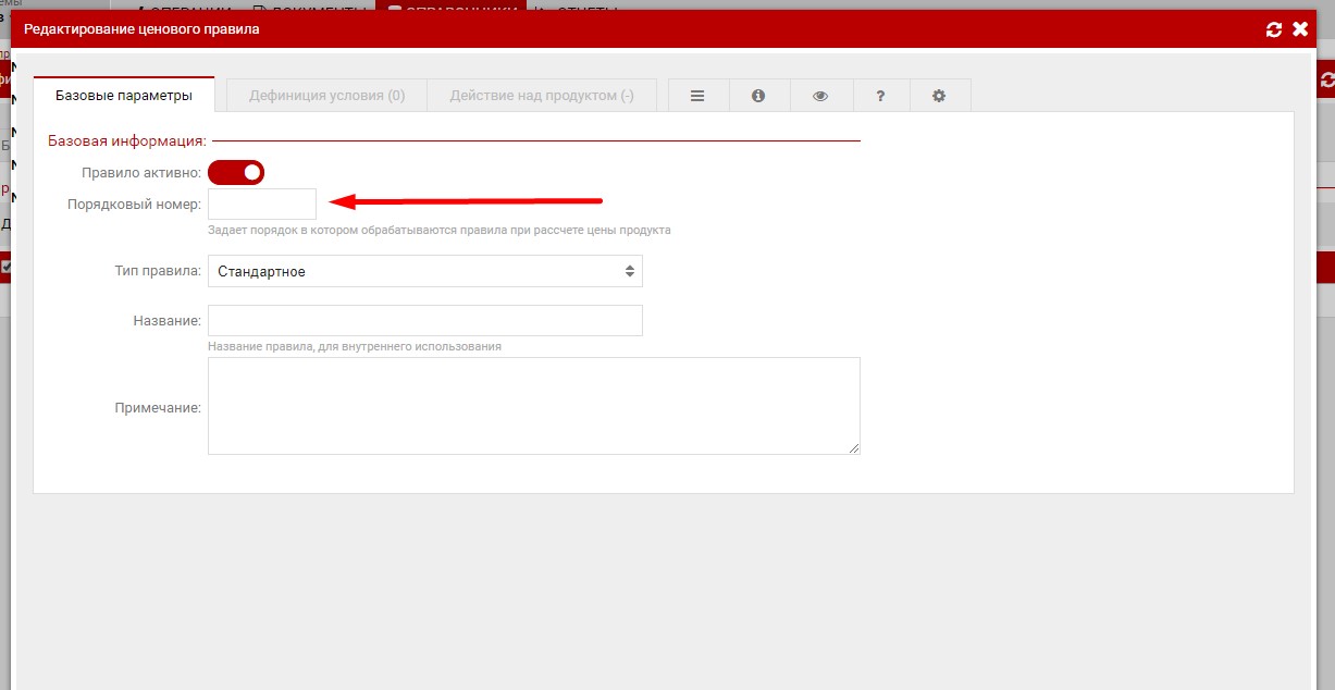 если вам необходимо изменить порядок правил, то в закладке "Базовые параметры" можно установить "Номер сортировки" - (Задает порядок в котором обрабатываются правила при рассчете цены продукта)