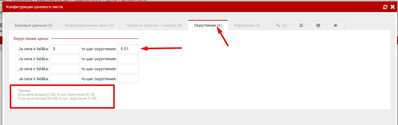Когда все правила наценки установлены, можно перейти перейти в закладку "Округление", там можно установить шаг округления, для различных ценовых интервалов.