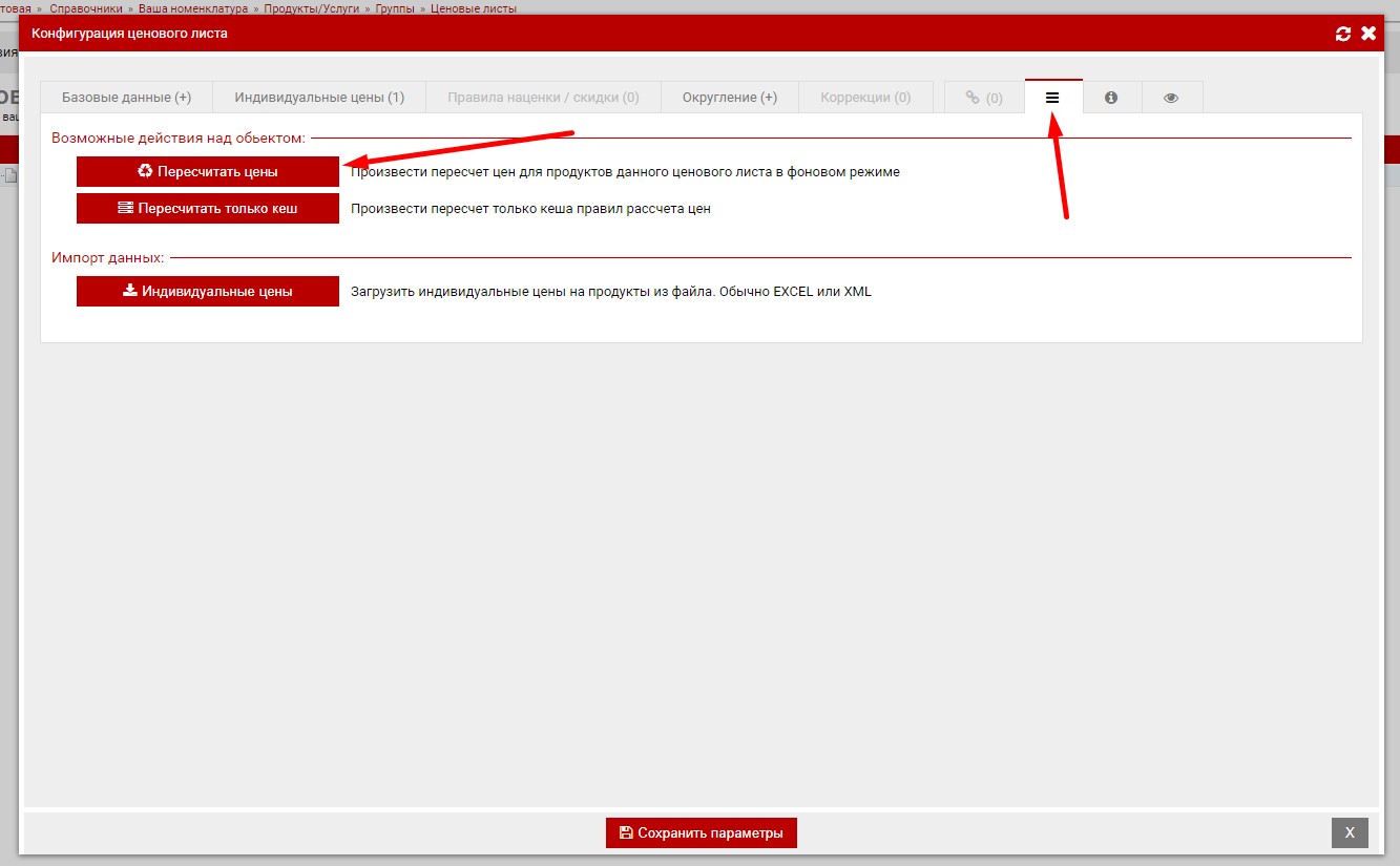 В закладке "Операции" есть кнопка "Пересчитать цены", она вызывает полный пересчёт цен на все продукты (в пределах данного листа) , ниже под ней есть возможност загрузить индивидуальные цены на продукты из файла (excel/xml).