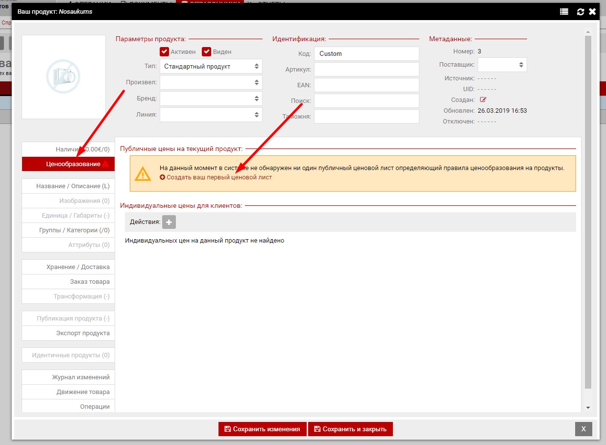 Если в вашей системе ещё нет ни одного ценового листа, то для создания первого можно открыть карточку любого из ваших продуктов, там перейти в закладку "Ценообразование" и выбрать "Создать ваш первый ценовой лист"