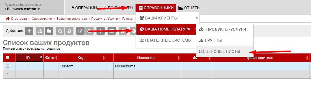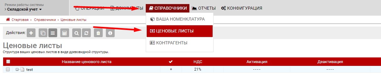 если в вашей системе уже создан хоть один ценовой лист и вам необходимо создать дополнительный, то список всех ценовых листов можно найти в разделе "Справочники">>"Ценовые листы"