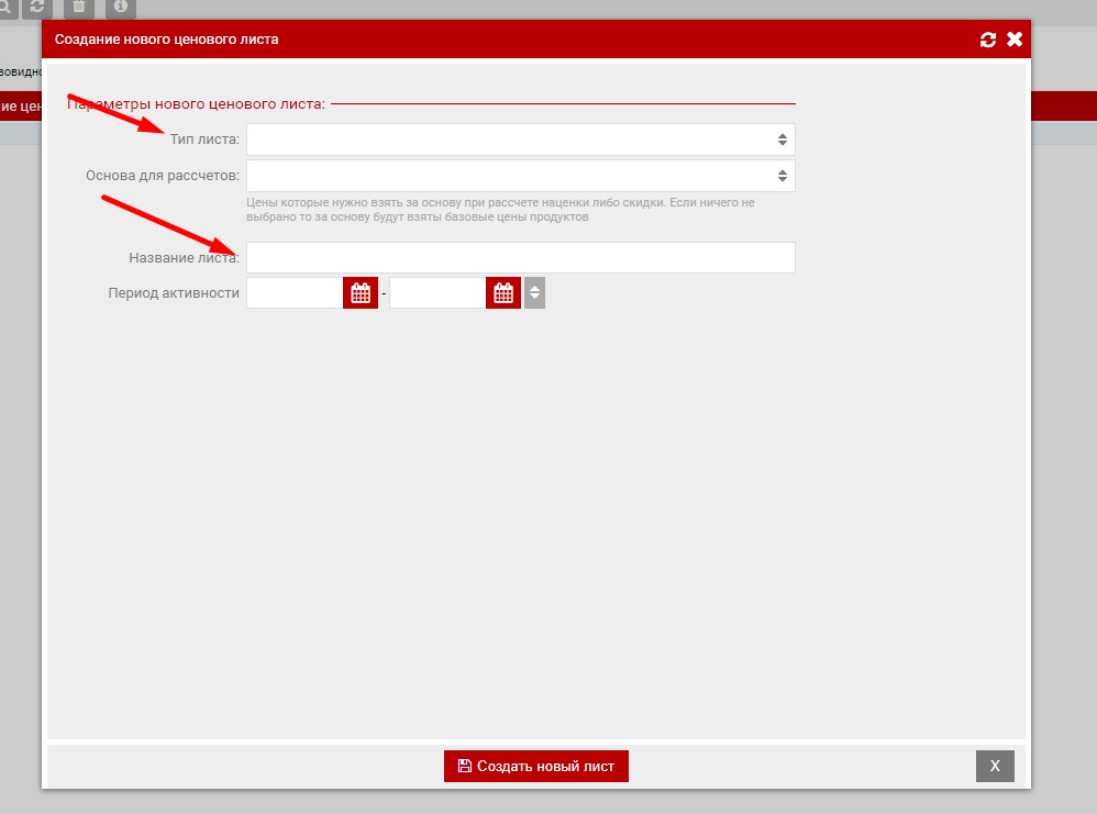 - Лист за основу может брать базовые цены или цену из другого ценового листа