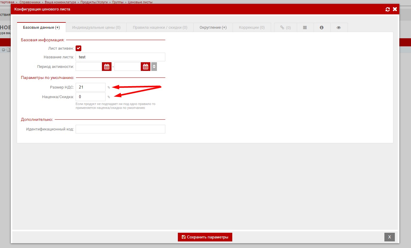 Далее, вводим ставку НДС и наценку по умолчанию (Если продукт не попадает ни под одно правило, то применяется наценка/скидка по умолчанию)
