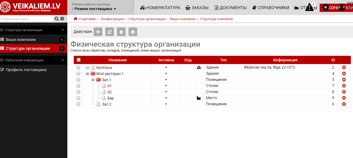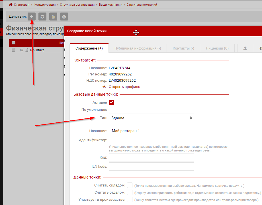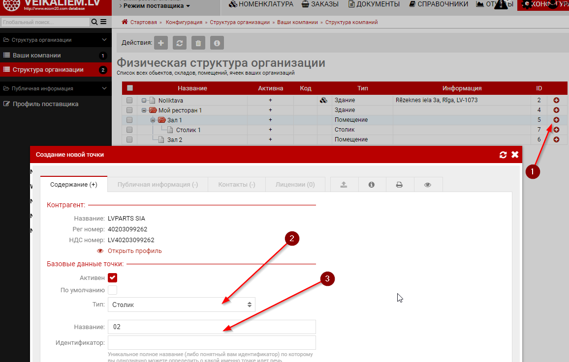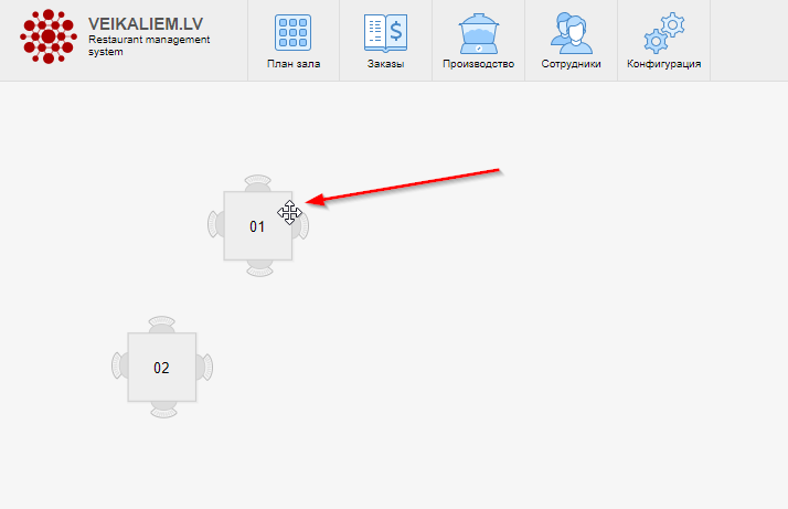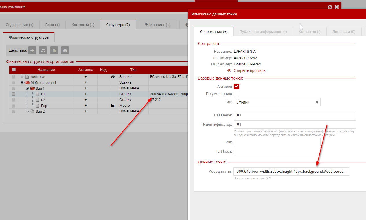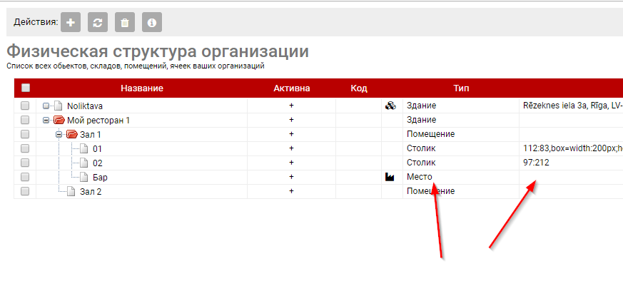 Конфигурация структурыДалее нужно ввести залы, столики, точки производства. Начнем с простого ввода без формирования плана зала. Тут формируем структуру. Ниже показан пример 1 ресторана с несколькими залами и точками производства. Обратите особое внимание на Типы точек и маркеры "участвует в производстве". Их правильное заполнение важно, так как по этим маркерам система определеяет как и что показывать на плане и также это влияет на конфигурацию кухонных принтеров и данных о производстве.Визуализируем помещенияТак как зал визуализируется через HTML разметку то по факту оформить его можно с любой детализацией (включая перегородки, фонтаны и кактусы). На практике-же это обычно одноразовая операция и высокая детализация не нужна. Поэтому инструментарий в интерфейсе позволяет делать только базовые вещи а при необходимости сложной визуализации вы можете обратится к нам.