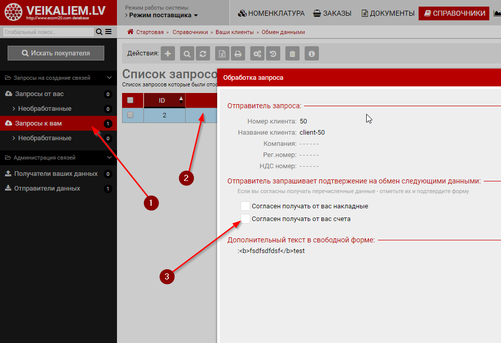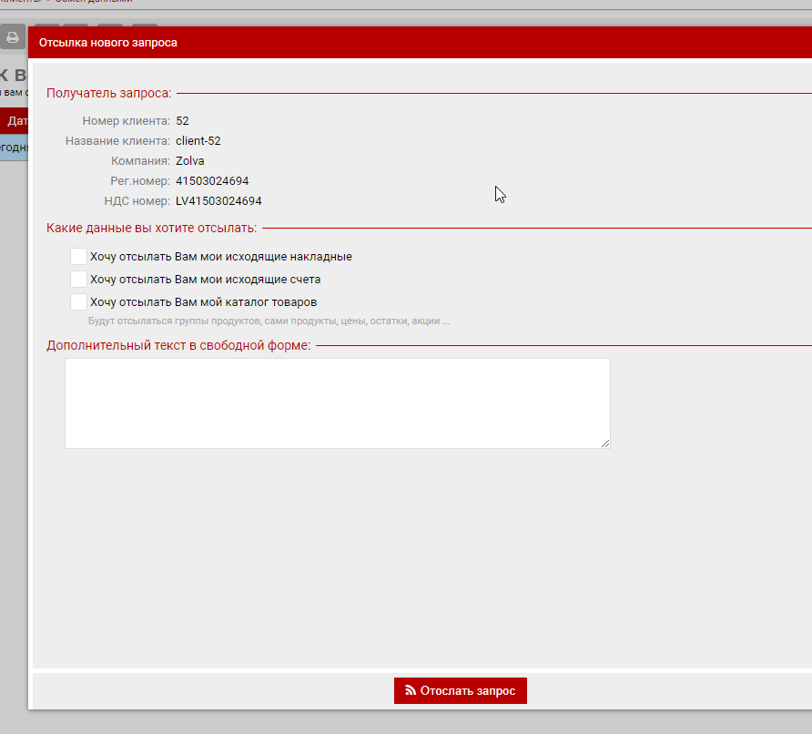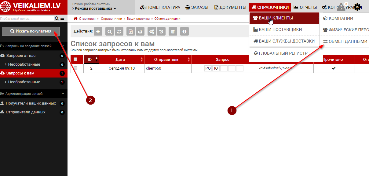Сформировать запрос можно из разных режимов работы системы, ниже рассмотрим один из них: Отсылка запроса из режима поставщикаЕсли связь устанавливаестя с новой компанией которой еще нет в списке ваших компаний то делается это следующим образом: