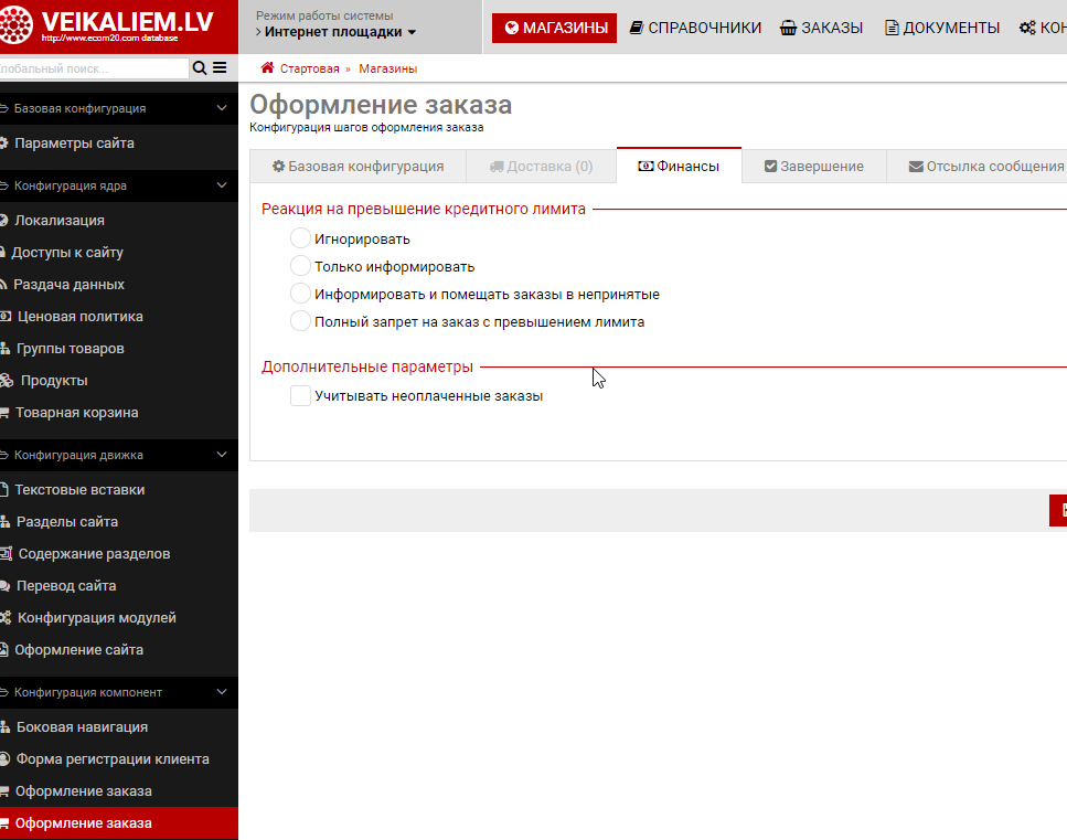 По умолчанию наши интернет площадки работают с должниками следующим образом: Учет текущих заказов при рассчете лимитаОдним из важных факторов при работе с кредитным лимитом является наличие у клиента незавершенных заказов. Рассмотрим ситуацию - клиент имеет остаток кредитного лимита 100 Eur. Если клиент сделает подряд 3 заказа по 100 Eur то система должна уже после первого заказа самостоятельно уменщить кредитный лимит клиента на 100 Eur и не дать сделать 2 последующих (или предупредить клиента/оператора). Данный режим работы НЕ ВКЛЮЧЕН по умолчанию и также активируется в конфигурации (скрин выше). Причина в том что данный режим работы налагает на вас ответственность корректно вести все принятые заказы выставляя им оплату и корректные статусы. |