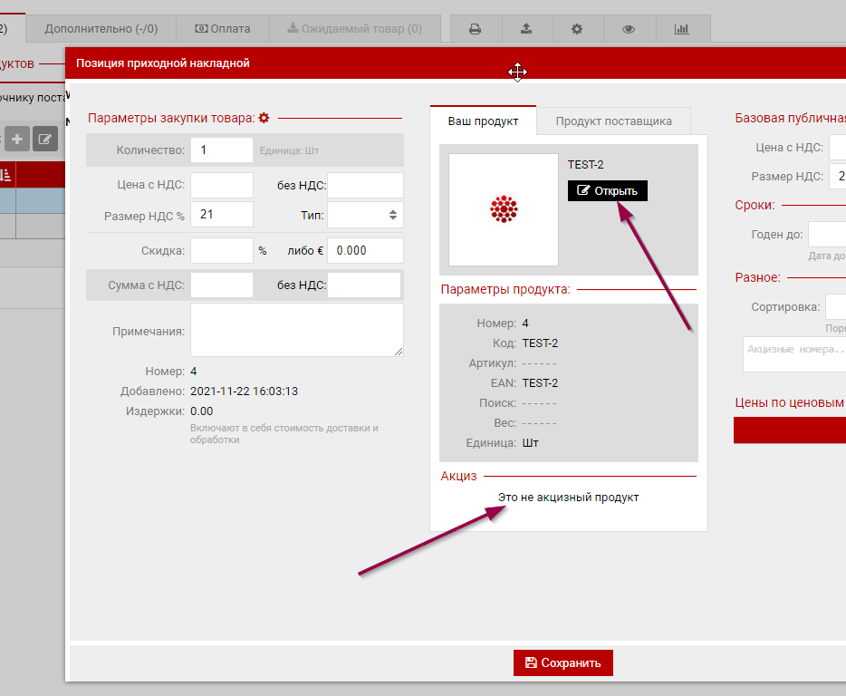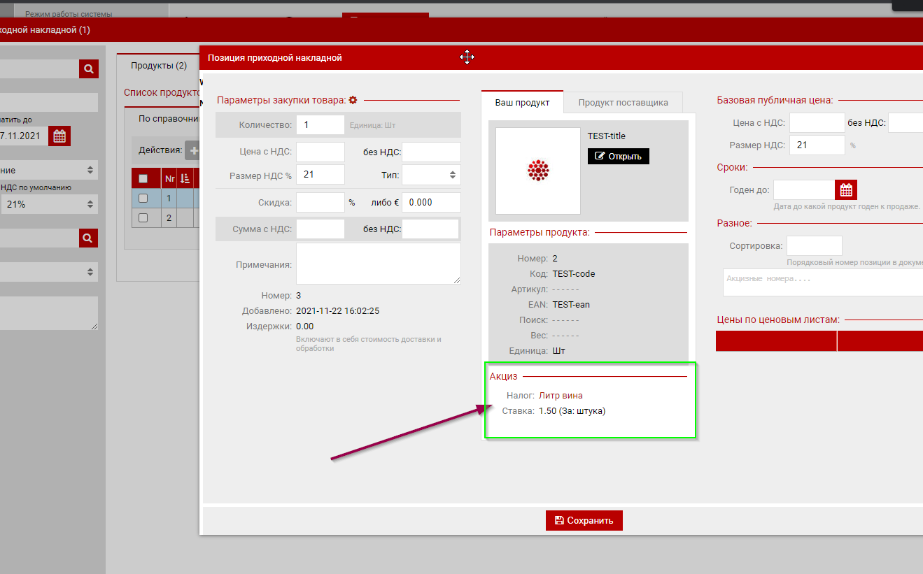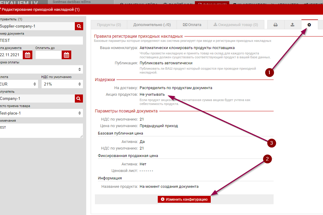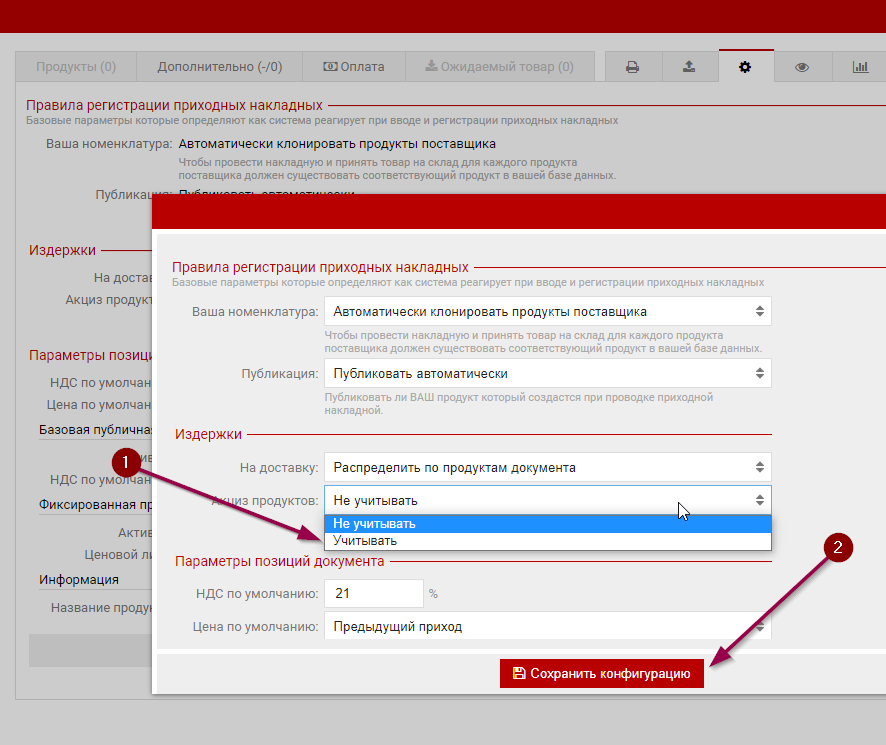 Активация режим учета акциза в себестоимости при проводке приходной накладнойСменить конфигурацию вы можете прямо из формы приходной накладной: Предварительная конфигурация продуктовКонфигурировать вы можете как свой продукт так и продукт поставщика, принцип одинаков. Учтите что если при вводе накладной конфигурация найдена и в продукте поставщика и в вашем продукте то данные будут взяты из продукта поставщика. Также имейте ввиду что в зависимости от того как вы сконфигурировали налог для рассчетов может понадобится дополнительная информация. Например обьем продукта как на примере ниже. Ввод позиций с акцизом в приходную накладнуюЕсли при вводе позиции вы создаете новый продукт то выберите нужный акциз и укажите дополнительные параметры которые система у вас запросит (зависист от того как сконфигурирован акциз). Если при вводе позиции вы выбираете из уже созданных продуктов то данные об акцизе увидите в соответствующем блоке. Если у продукта нет данных об акцизе и это неверно то вы можете указать акциз в профиле продукта, сохранить и обновить экран. Если в накладной есть продукт с акцизом то автоматически добавляется колонка с информацией об этом акцизе. После проводки документа в карточке продукта для введенной партии вы должны увидеть дополнительные издержки рассчитанные в соответствии с указанным акцизным налогом. Далее все рассчеты прибыли вы будете видеть уже с учетом этой себестоимости.Ввод акцизных номеров при вводе накладной