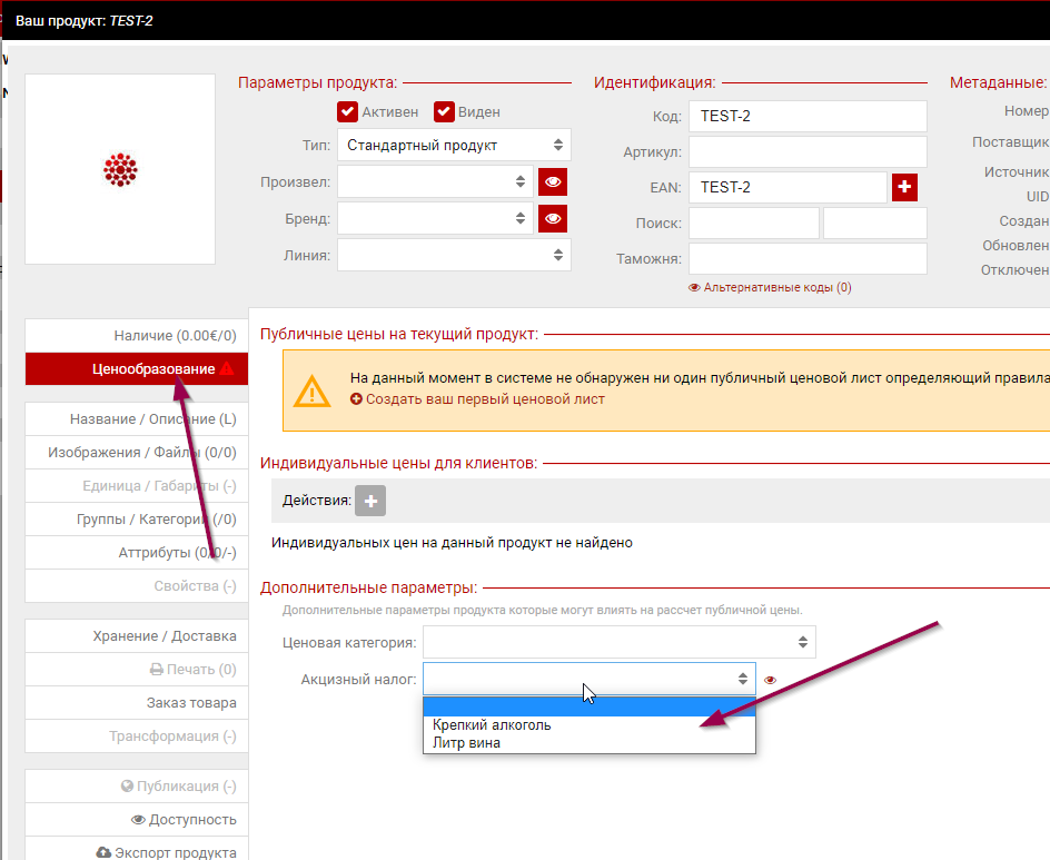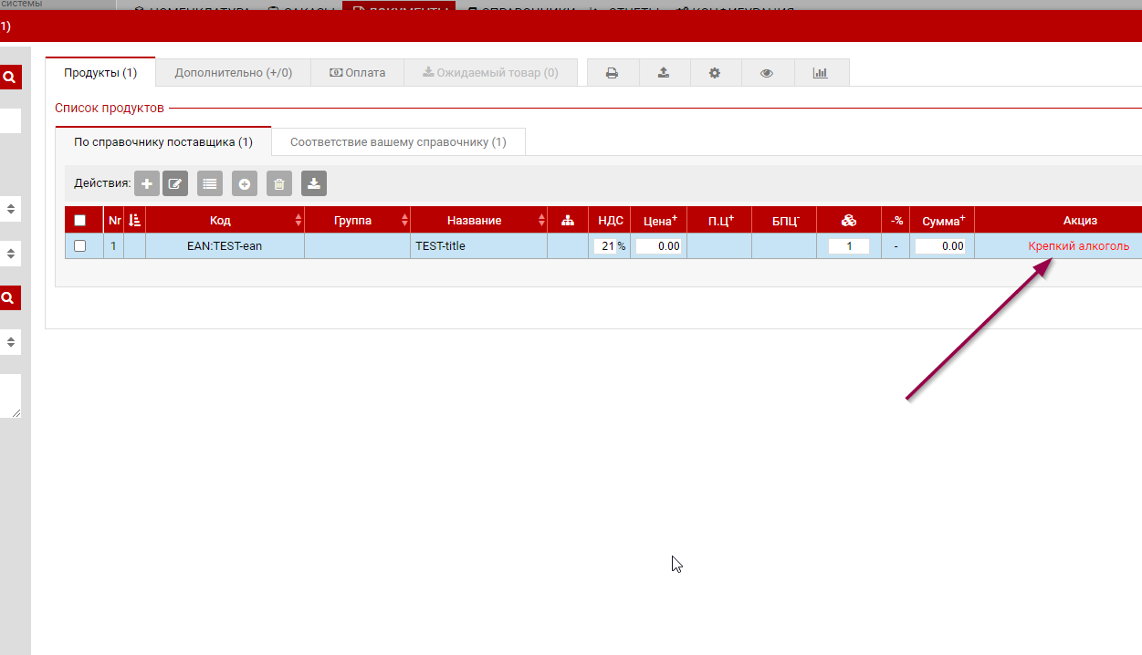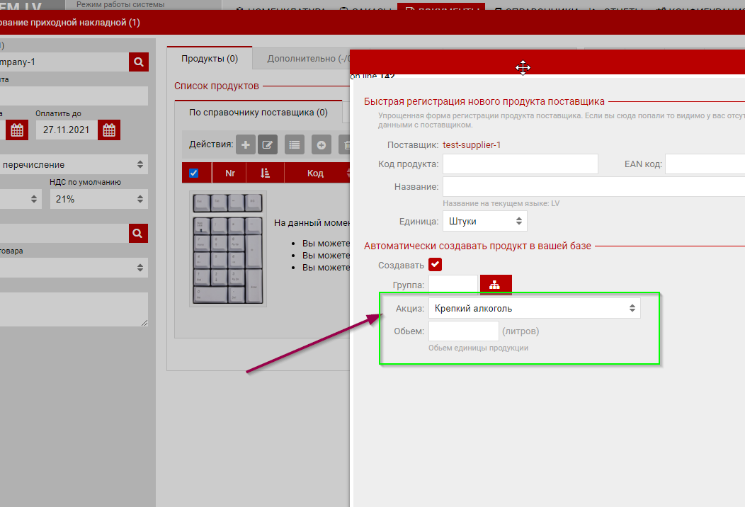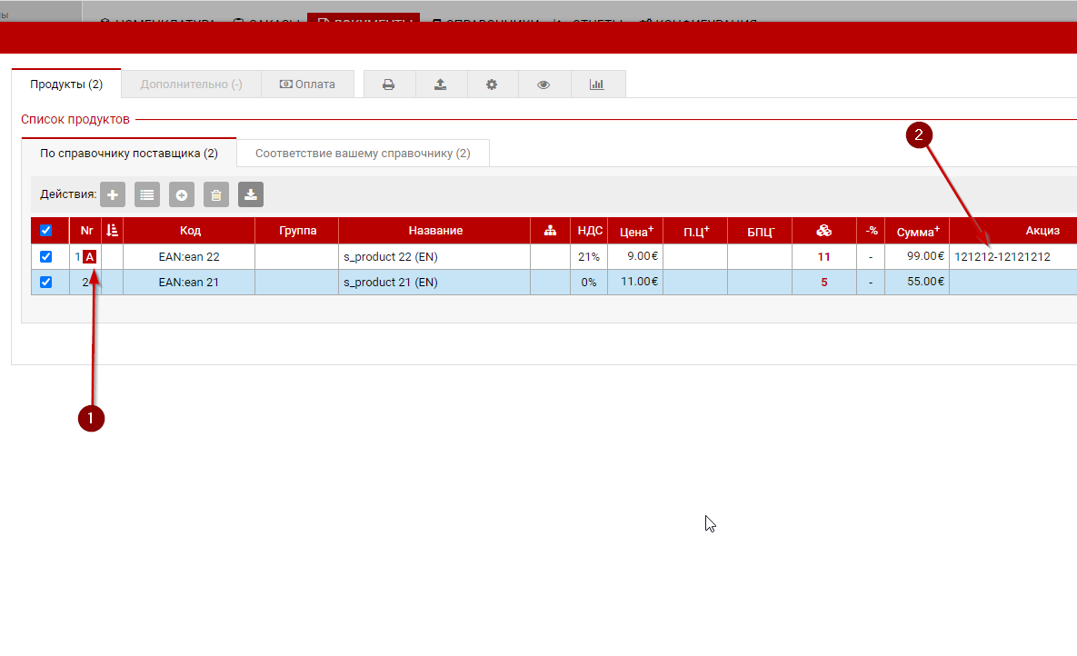 Активация режим учета акциза в себестоимости при проводке приходной накладнойСменить конфигурацию вы можете прямо из формы приходной накладной: Предварительная конфигурация продуктовКонфигурировать вы можете как свой продукт так и продукт поставщика, принцип одинаков. Учтите что если при вводе накладной конфигурация найдена и в продукте поставщика и в вашем продукте то данные будут взяты из продукта поставщика. Также имейте ввиду что в зависимости от того как вы сконфигурировали налог для рассчетов может понадобится дополнительная информация. Например обьем продукта как на примере ниже. Ввод позиций с акцизом в приходную накладнуюЕсли при вводе позиции вы создаете новый продукт то выберите нужный акциз и укажите дополнительные параметры которые система у вас запросит (зависист от того как сконфигурирован акциз). Если при вводе позиции вы выбираете из уже созданных продуктов то данные об акцизе увидите в соответствующем блоке. Если у продукта нет данных об акцизе и это неверно то вы можете указать акциз в профиле продукта, сохранить и обновить экран. Если в накладной есть продукт с акцизом то автоматически добавляется колонка с информацией об этом акцизе. После проводки документа в карточке продукта для введенной партии вы должны увидеть дополнительные издержки рассчитанные в соответствии с указанным акцизным налогом. Далее все рассчеты прибыли вы будете видеть уже с учетом этой себестоимости.Ввод акцизных номеров при вводе накладной