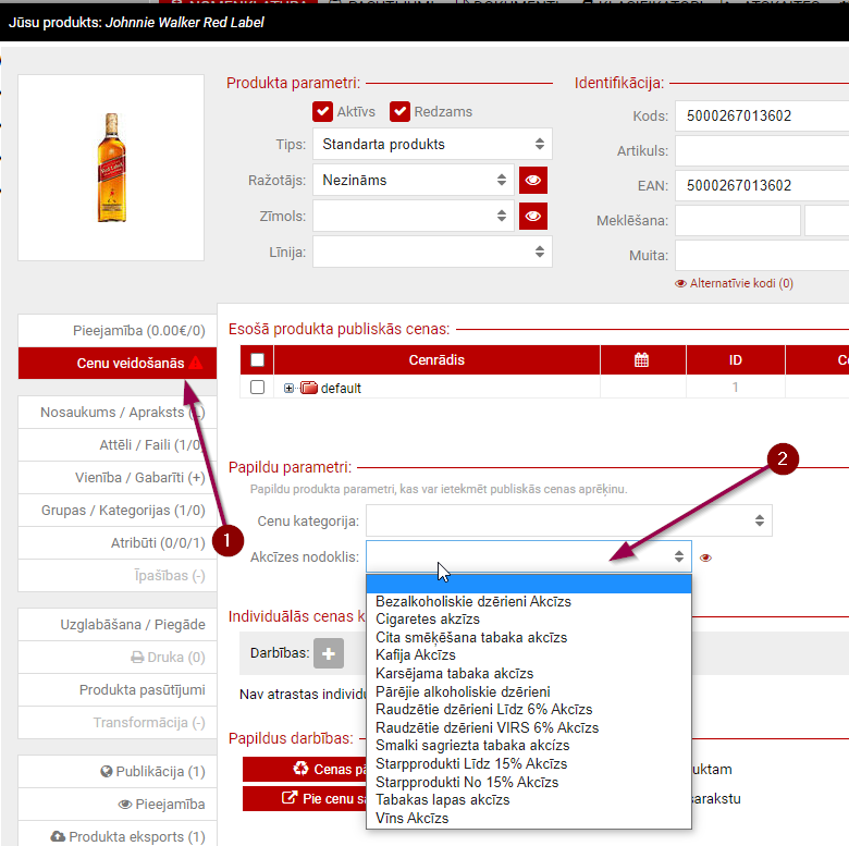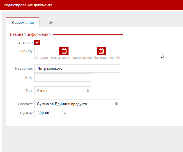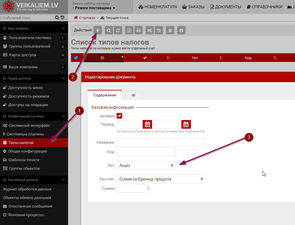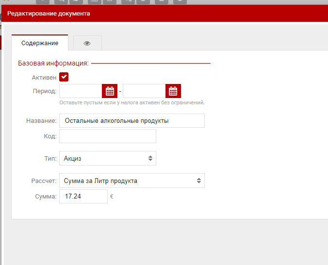 Конфигурация акцизных налоговКонфигурация налогов происходит в разделе Системная конфигурация => Типы налогов. Перейти можете по ссылке: https://{YOUR_SYSTEM_ID}.veikaliem.lv/settings/window.settings.php?menu=l_fin_tax-listing При создании акцизного налога нужно понимать принцип рассчета. Рассмотрим пример создания налога на базе алкогольной продукции.