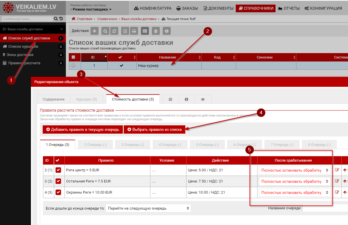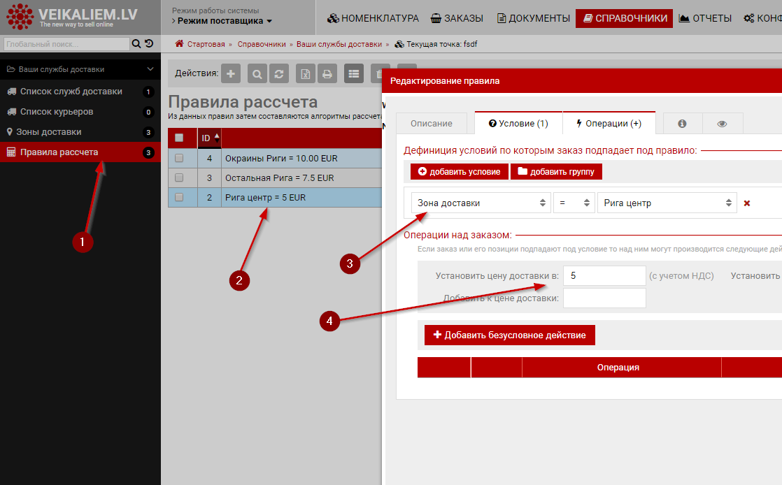 Правила можно создать и из профиля службы доставки, но проще создать их заранее и потом уже добавить к службе доставки.