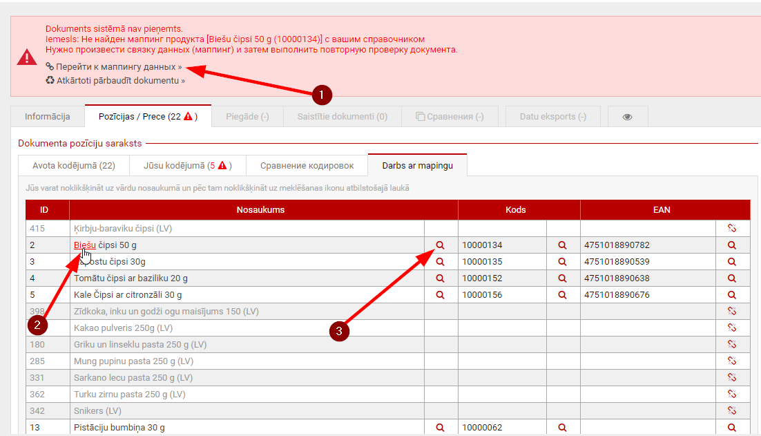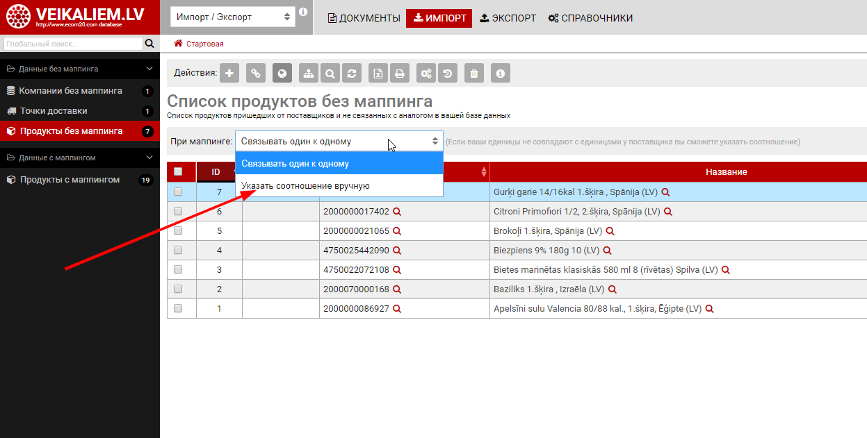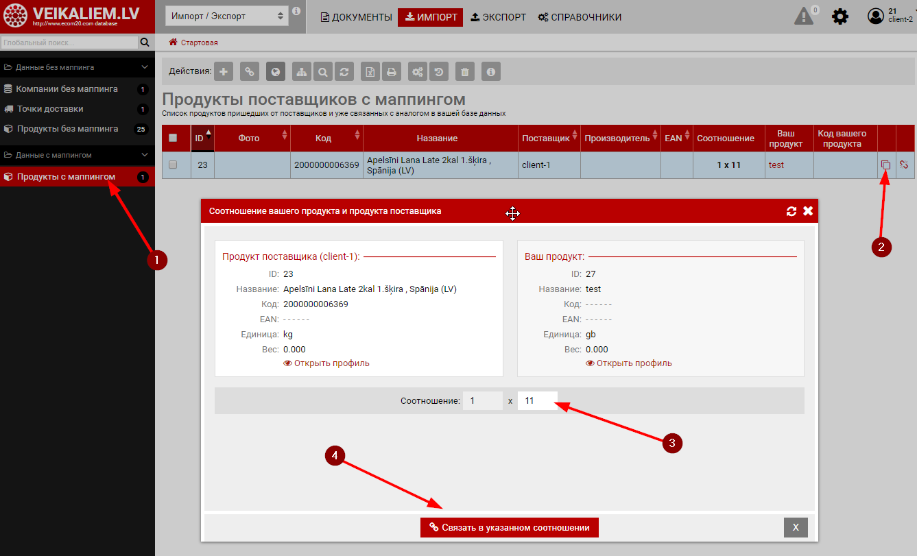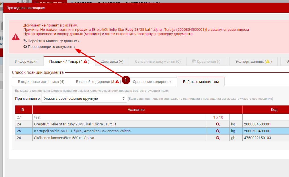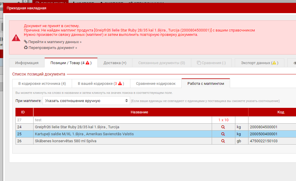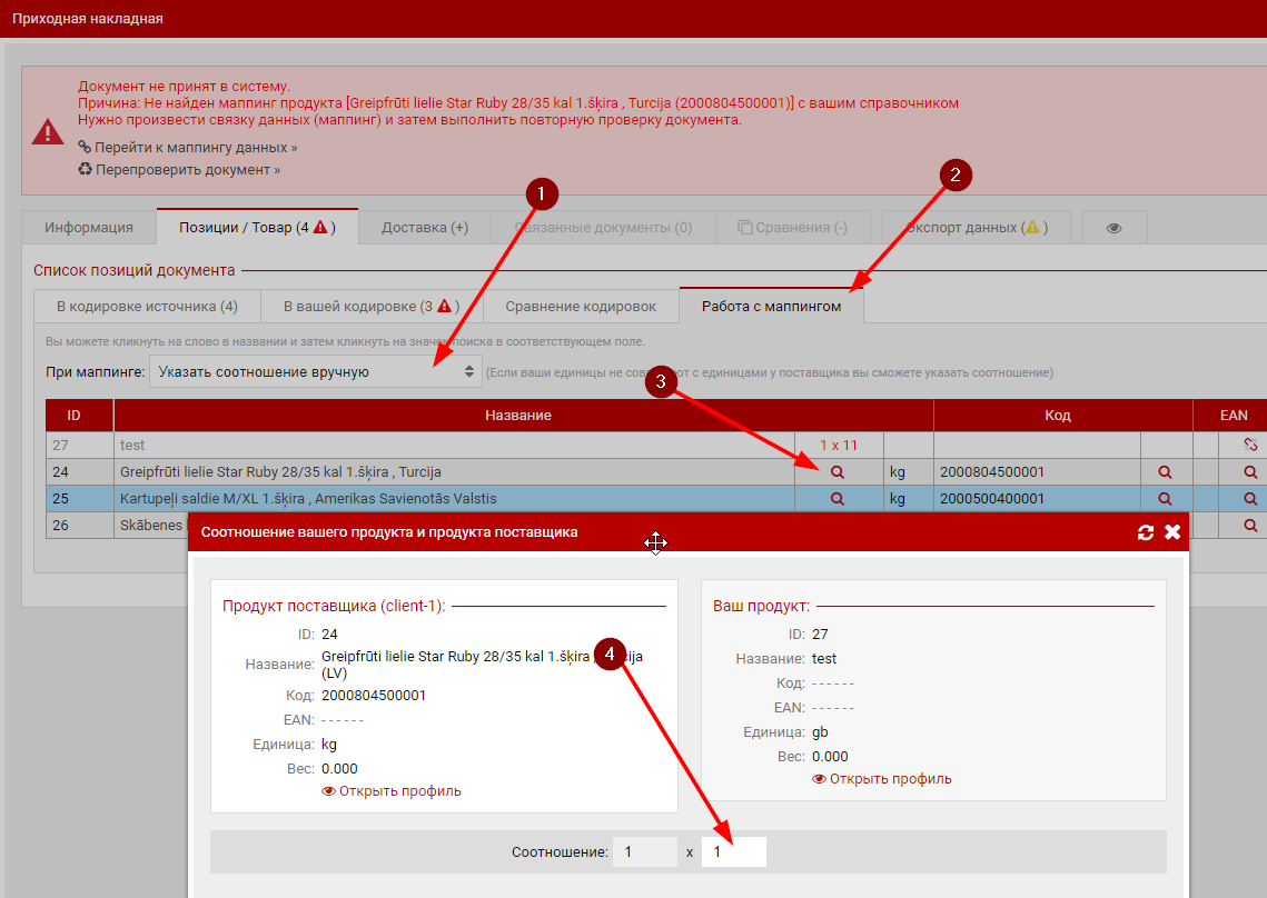 Маппинг каталога товараТермином маппинг мы обозначаем связь продукта поставщика с вашим продуктом в IIKO. Так как вы ведете свой каталог в своих кодах, названиях и единицах измерения а поставщик в своих то при принятии документа от поставщика нам нужно понимать какая позиция какому продукту соответствует. Маппинг в форме документаЧаще всего вопрос маппинга встает когда мы получаем документ и не можем его принять в систему (1). В этом случаем мы можем произвести маппинг прямо в окне документа (2). Для облегчения поиска вы можете кликнуть на фразу в названии продукта (она подсветится красным) (2-2) и затем нажать на поиск (2-3). После чего повторно вызать проверку документа (3). Массовый маппингВ ситуации когда поставщик отсылает вам свой полный каталог товара может иметь смысл перед принятием документов произвести маппинг всех известных продуктов поставщика. Принцип маппинга в этом разделе такой-же как и описанный выше. Различное соотношение товара при импортеВстречается ситуация когда единица измерения продукта у поставщика не совпадает с вашей. Например поставщик подает в документе "Салфетки, упаковка - 1 штука" но в вашу систему должно прийти "Салфетка - 50 штук". Тоесть 1 продукт у поставщика должен преобразоваться в 50 единиц в вашей системе. Установка соотношения при маппингеВ случае с маппингом из документа - нужно указать что соотношение будет установлено вручную и продолжить операцию как обчыно. Перед фиксацией маппинга система запросит у вас ввести соотношение. Аналогично работает и конфигурация при массовом маппинге. Изменение соотношенияИзменить соотношения для уже созданного маппинга можно в разделе массового маппинга: Влияние на документКак установка соотношения между продуктами влияет на документ: