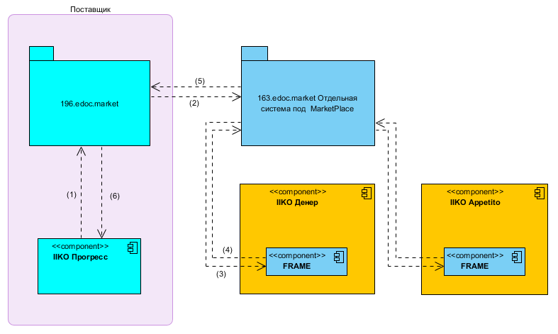 Общая схемаРассмотрим базовую схему работы с MarketPlace на примере 3 участников. Один из них (Прогресс) чистый постащик, 2 других (Денер и Appetito) чистые покупатели. Для Прогресса развернута отдельная edoc.market система, Денер и Appetito работают через наш Plugin для IIKO который в свою очередь соединяется с системой MarketPlace собранной на базе 163.edoc.market.