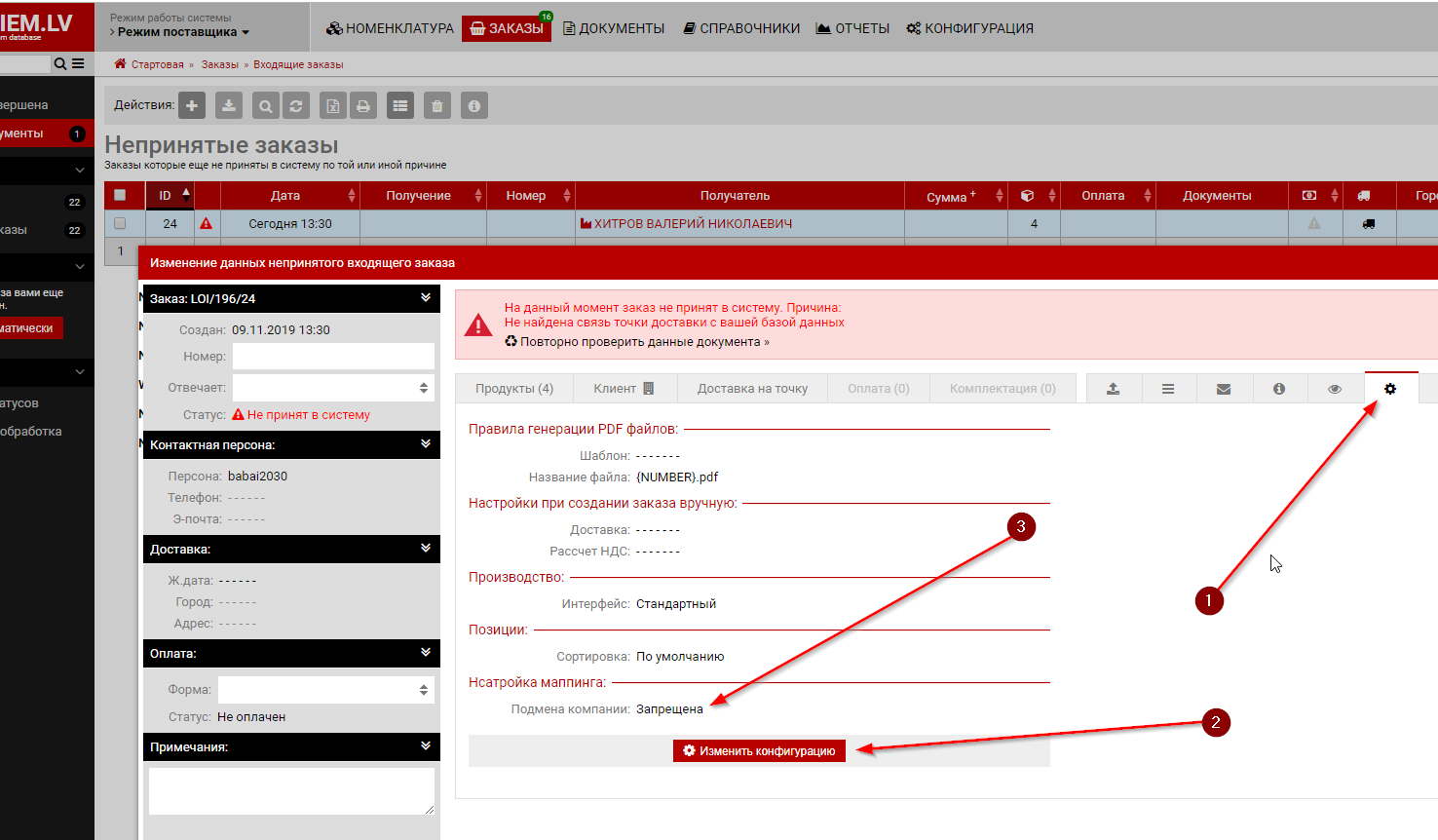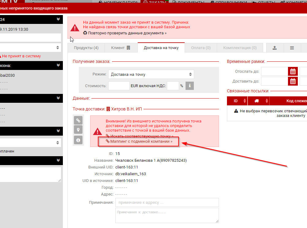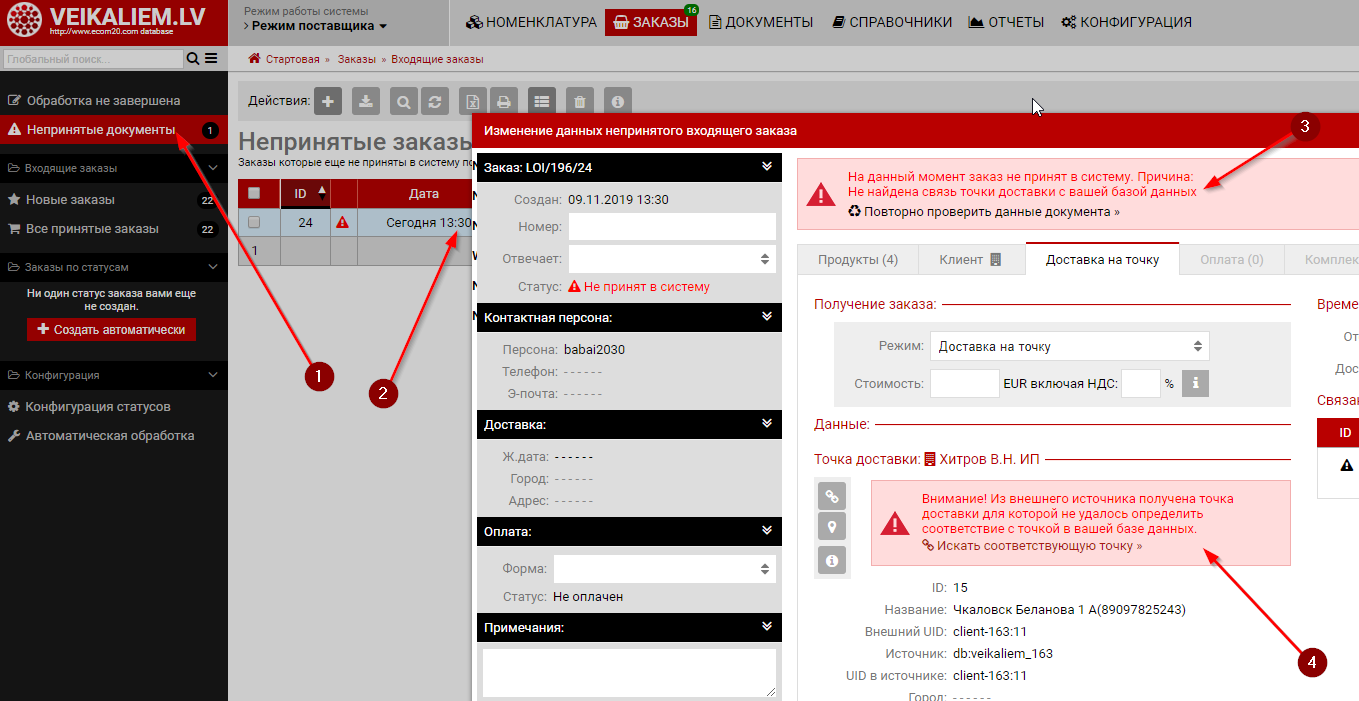 Когда первый раз в систему поставщика приходит такой заказ то он падает в "Непринятые документы" и система предлагает найти соответствующую точку в вашем каталоге.