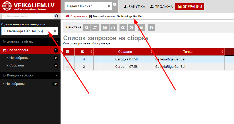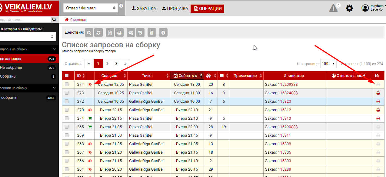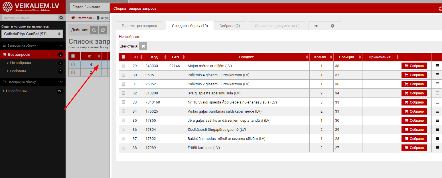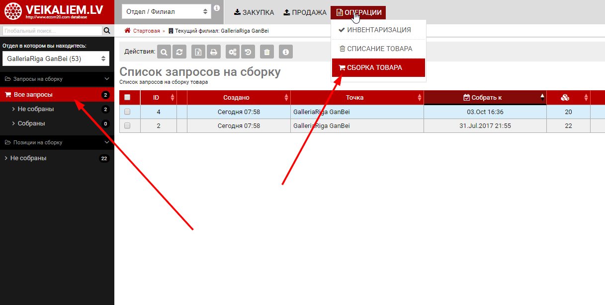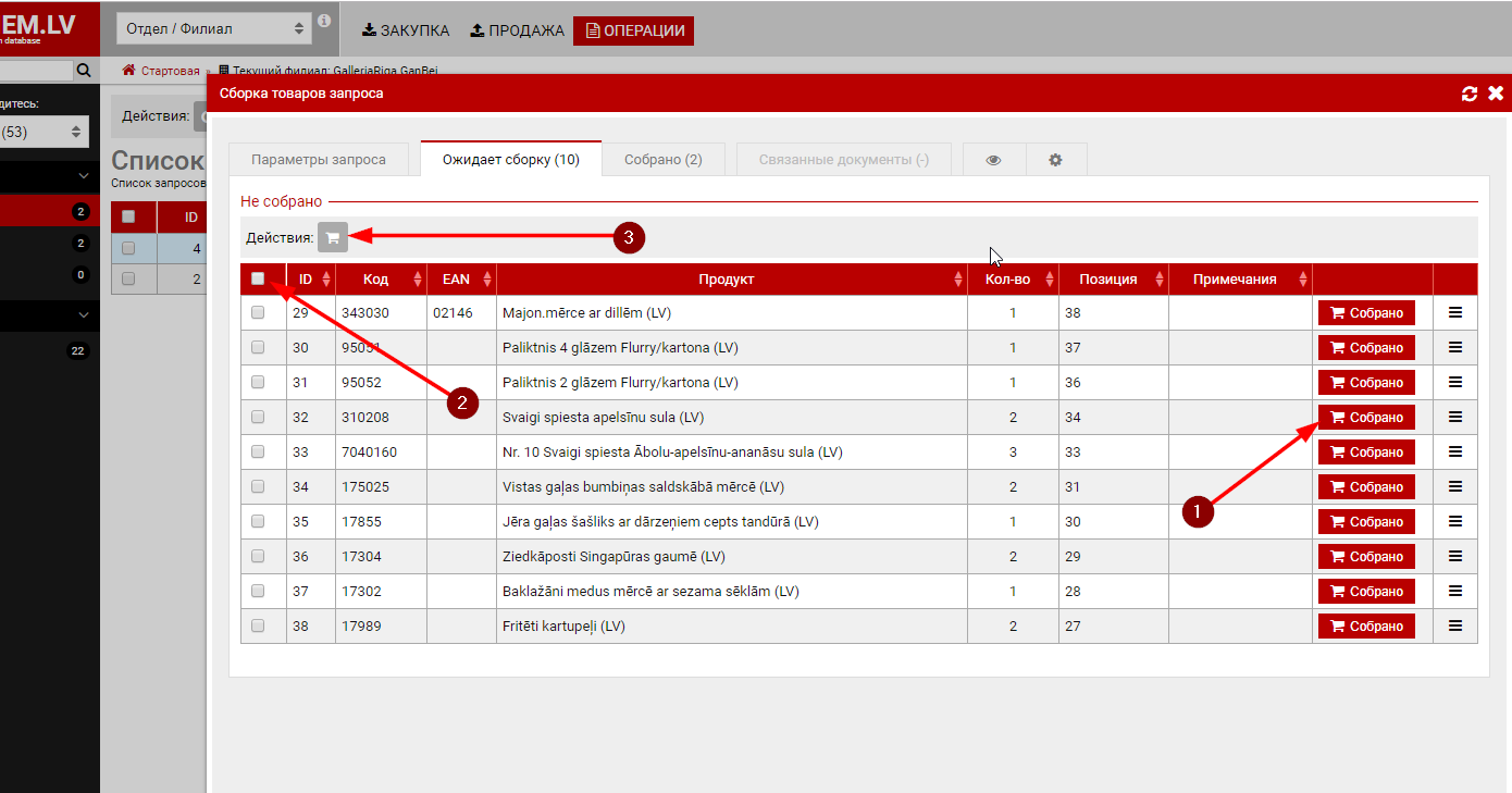 Чтобы увидеть запросы на сборку нужно октрыть раздел "Операции" => "Сборка товара". Смена статуса запроса на сборкуВ определенный момент вам нужно отметить что сборка произведена. Вы можете проводить сборку отмечая каждый продукт отдельно (1) либо выделив все собранные продукты (2) и нажав на "собрано все отмеченное" (3). Если все позиции запроса становятся "собраны" то весь запрос меняет свой статус на "Собран полностью". Контроль за состоянием со стороны ECOM системы и на Veikaliem.lv
