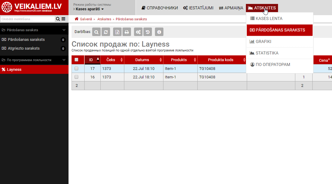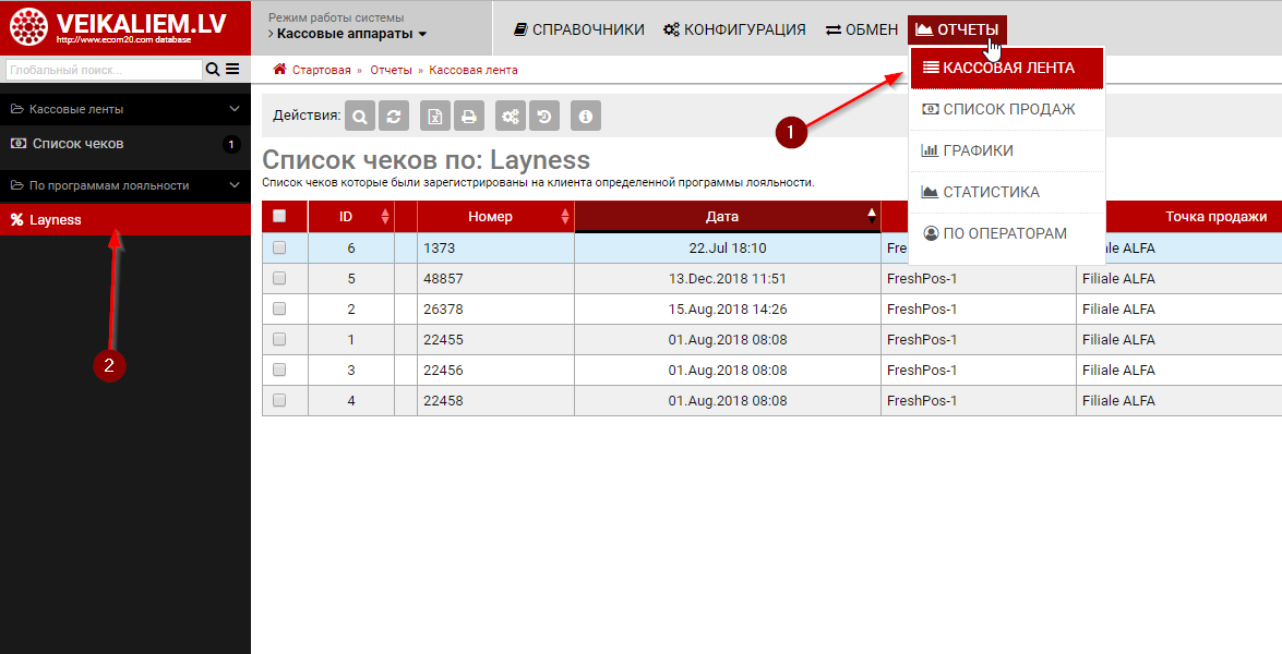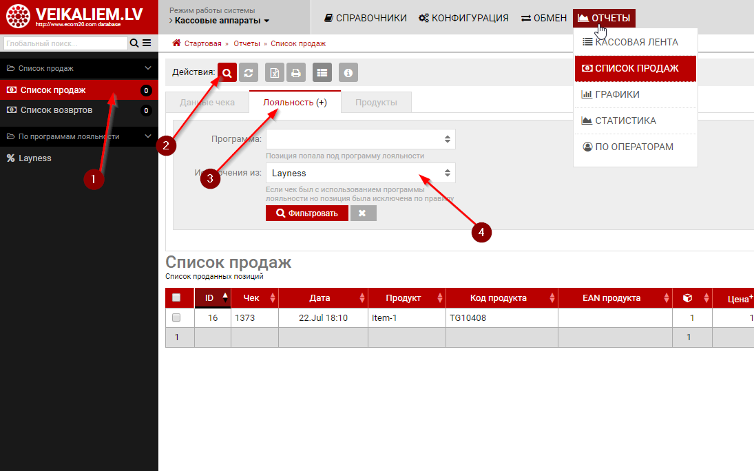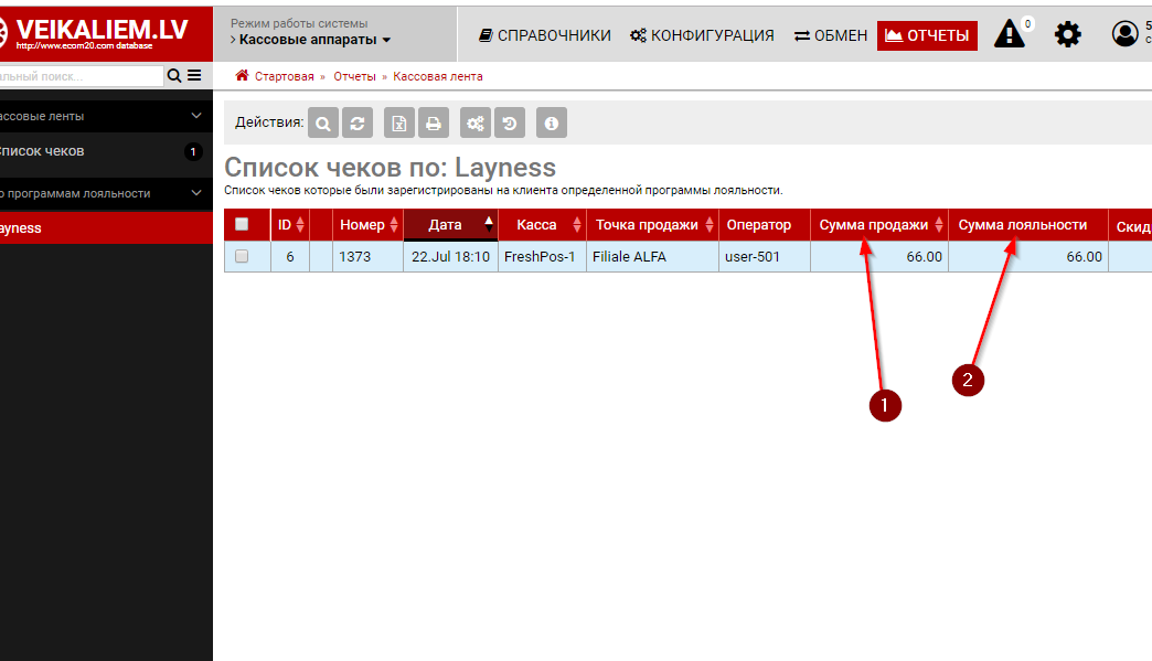 После конфигурации и получении первых чеков в списках продаж и чеков появится дополнительный блок -"По программам лояльности" где вы