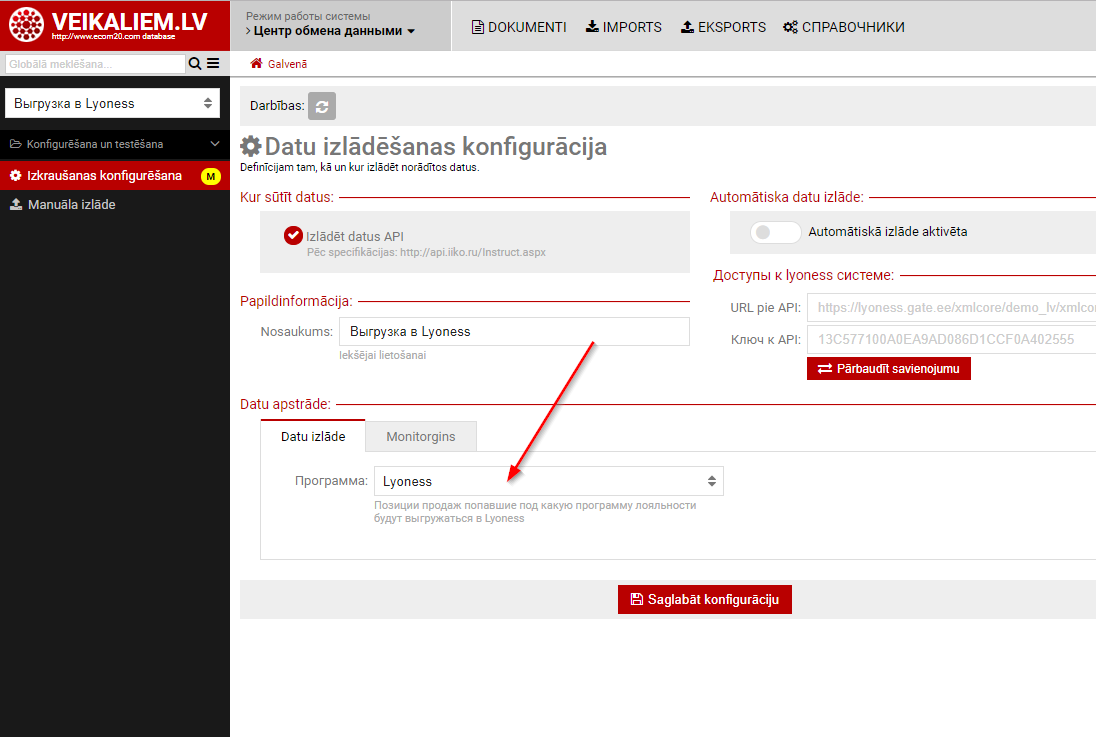 Конфигурация системыПредполагается что обмен с кассовым аппаратом уже существует и работает. Конфигурация программы лояльностиСоздается программа с 2 правилами (как минимум). Первое правило должно отмаркировать все позиции продажи. Второе должно исключить то что не должно отсылаться в Lyoness, например табачные изделия. Конфигурация маски карт попадающих под программуДанная конфигурация совершенно стандартна. Конфигурация экспортного шлюзаСоздание шлюза также в целом стандартно. Единственный ньюанс - нужно указать какая программа используется для выгрузки данных. Просмотр полученных данных по Lyoness