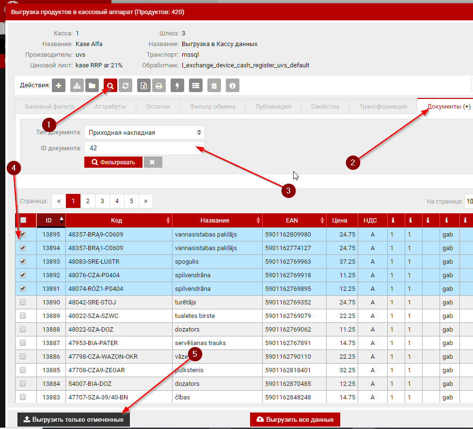 Выгрузка товара и цен в кассуТочечная ручная выгрузкаНа базе приходной накладнойЕсли вы хотите выгрузить в кассу тольно некоторое кол-во товара в виде теста то вы можете отфильтровать продукты по документу и выбрать нужные вам товары. |