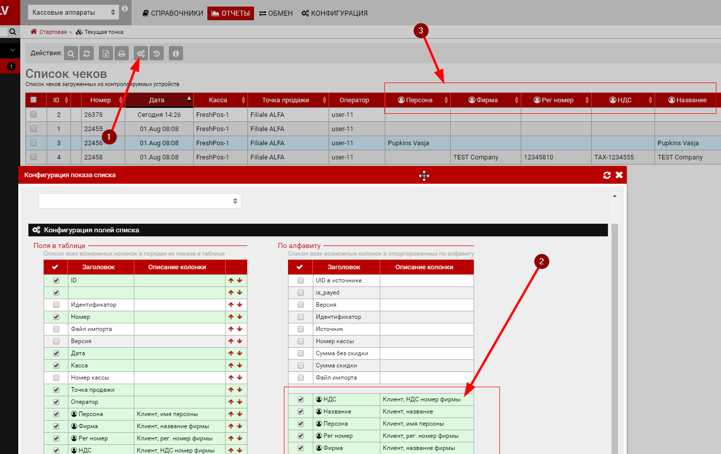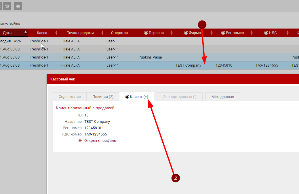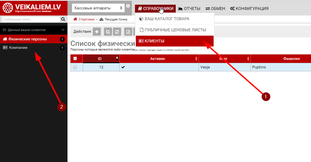 Передача данных на POSОперация стандартна. При выгрузке данных на POS система формирует необходимый массив данных в нужном формате. Нужно учитывать что юридические и физические персоны при передаче преобразуются в единый плоский список покупателей. Продажа и фиксация клиента при продажеПри продаже оператор тем или иным способом связывает чек с клиентом который был заранее получен из VEIKALIEM.LV. За детальной информацией по данному этапу и работе в интерфейсе PPSHOP обращайтесь в BRIO Engineering. Получение данных из POS-системС определенным интервалом VEIKALIEM.LV забирает данные о продажах с кассовых систем. Если чек связан с клиентом то данная информация обрабатыватеся и профиль и история клиента обновляется. Показ полученных данных в системеПо умолчанию в списках чеков данные о клиентах не показываются. Вы можете активировать показ через настройку колонок. Также данные о клиенте видны в данных чека. |